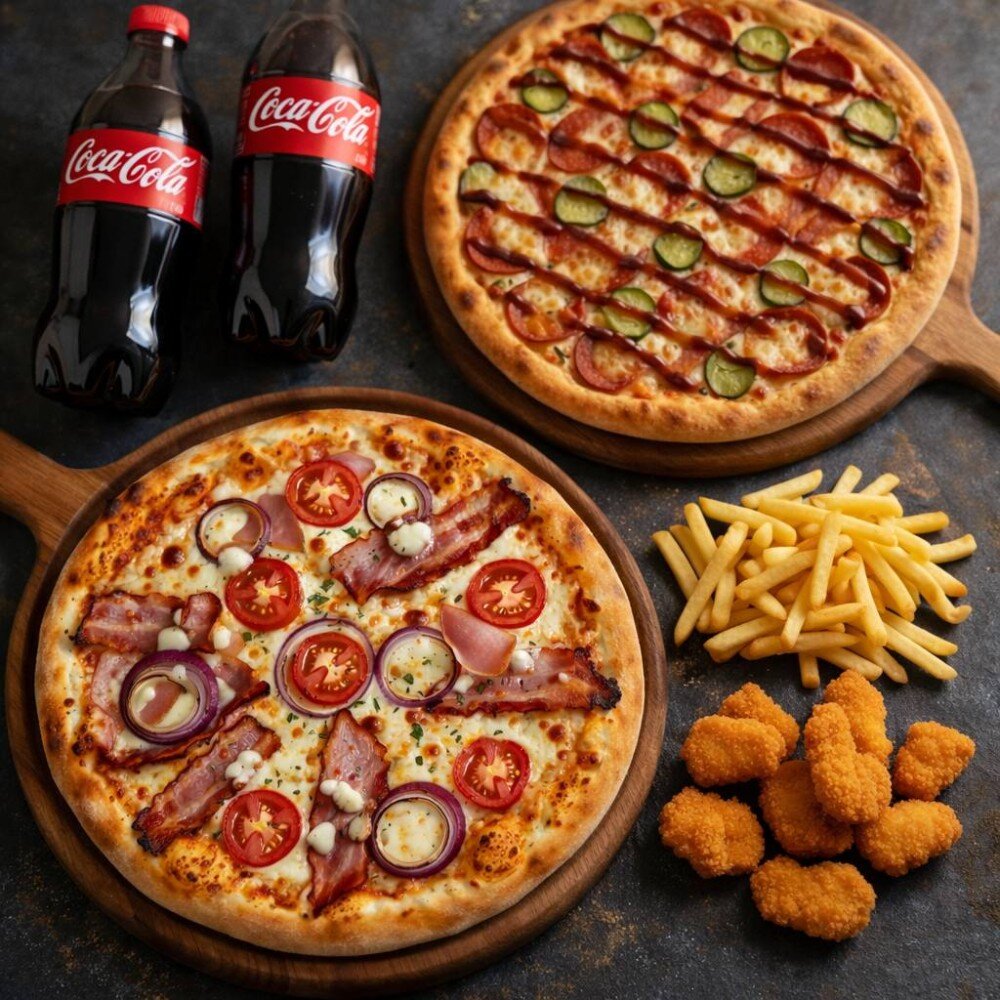 Пицца БЕКОН ВАЙБ + Пицца BBQ ПЕППЕРОНИ + Картофель фри большой + Наггетсы 8 шт. + 2шт. Coca-Cola 1л