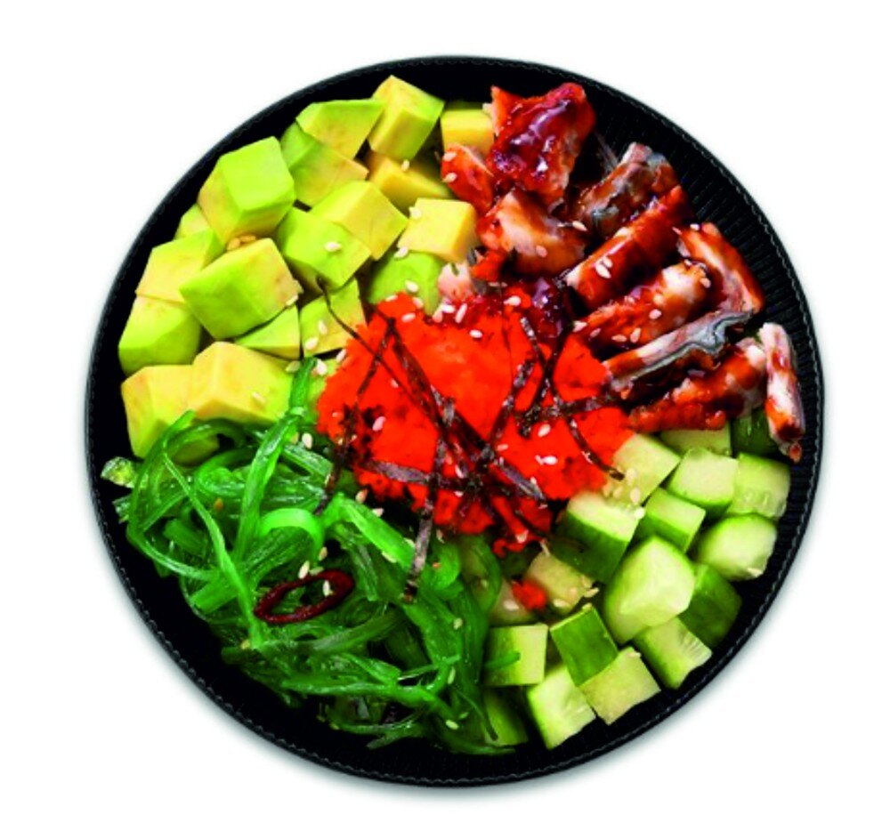 Рис, угорь, авокадо, огурец, икра масаго, чука, ягоды годжи, соус.
