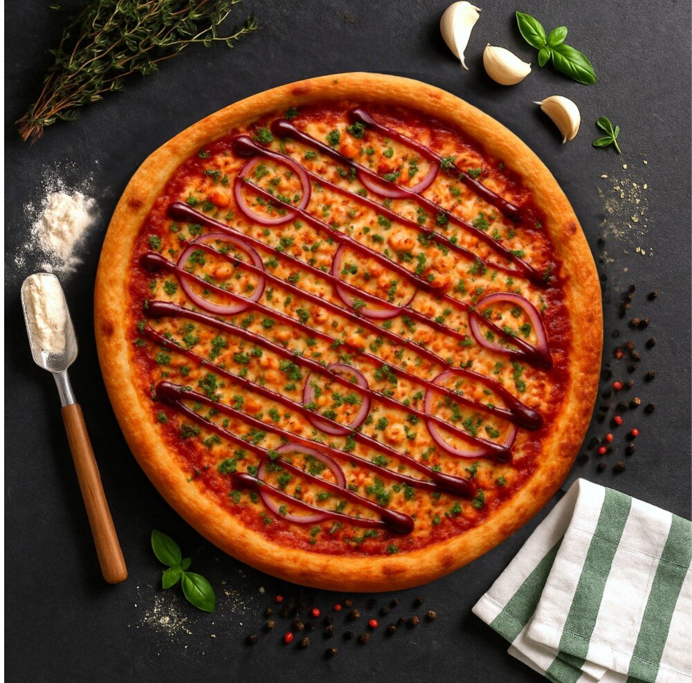 Тесто, BBQ соус, сыр моцарелла, курица, лук, прованские травы.