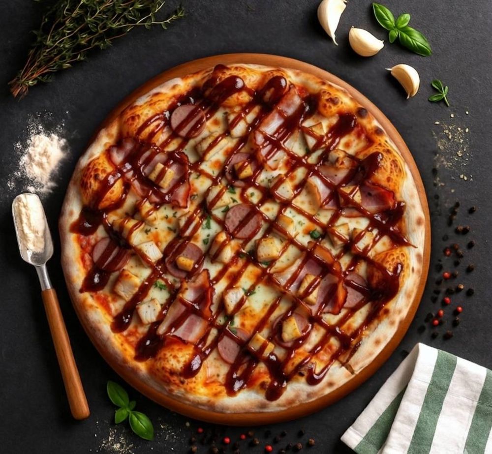 Тесто, соус пилати, сыр моцарелла, курица, бекон, колбаски охотничьи, барбекю соус, прованские травы
