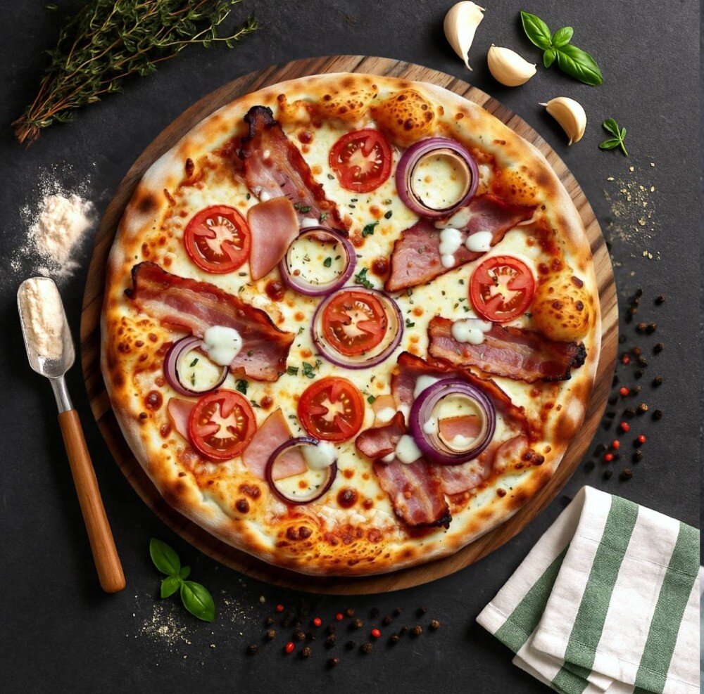 Тесто, сливочно-чесночный соус, сыр моцарелла, бекон, ветчина, томаты, лук, прованские травы.