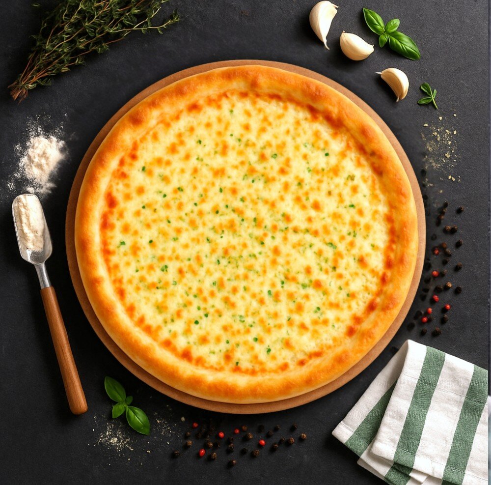 Тесто, сливочно-чесночная основа, сыр моцарелла, чеддер, бри, дор блю, прованские травы.