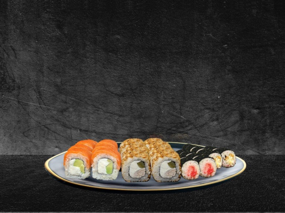 🍣 Лайк: Рис, нори, сыр творожный, ветчина, огурец, лук кранч, соус терияки - 250 гр.